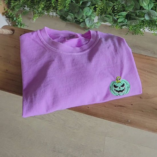 Create your own embroidered jack-o’-lantern tee. Choose your pumpkin shape, face, and thread colors for a fully personalized design. Each shirt is stitched on a soft, garment-dyed Comfort Colors tee for that worn-in, vintage feel.